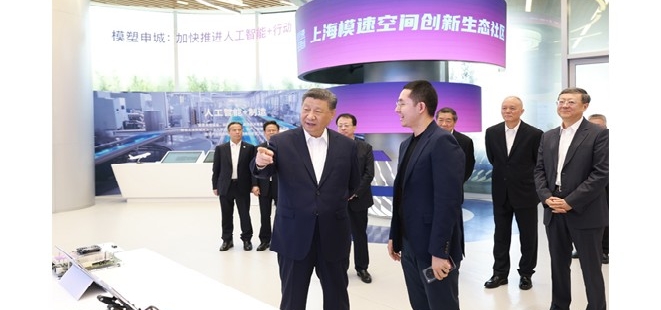 4月29日,中共中央总书记、国家主席、中央军委主席习近平在上海考察。这是习近平在位于徐汇区的上海“模速空间”大模型创新生态社区,察看...