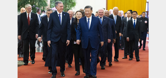10月11日上午,国家主席习近平在北京人民大会堂集体会见出席中国国际友好大会暨中国人民对外友好协会成立70周年纪念活动的外方嘉宾。这是习...