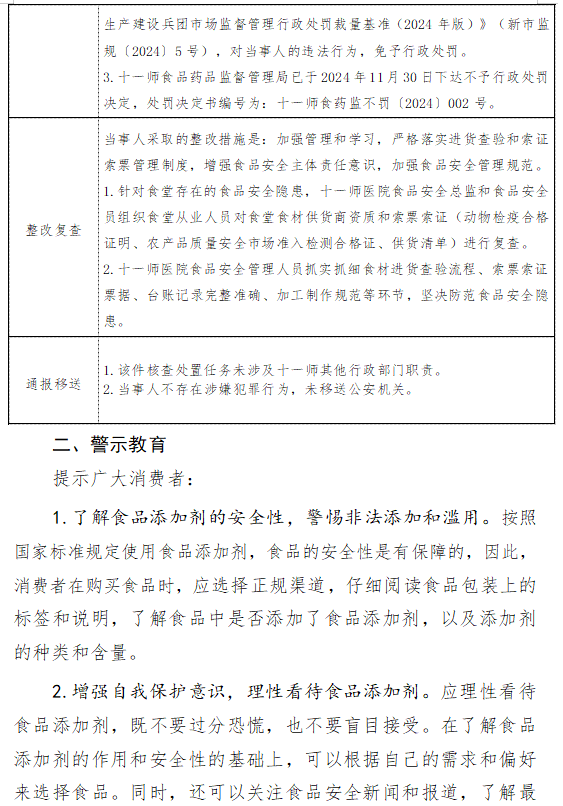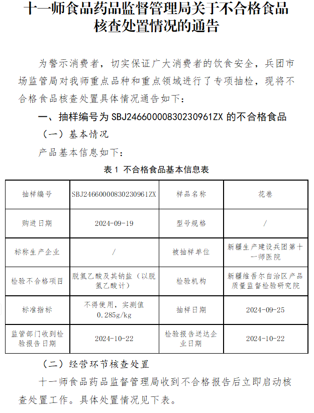 十一师食品药品监督管理局关于不合格食品核查处置情况的通告