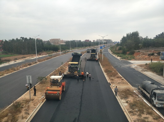 近日,北新路桥集团长沙分公司晋江市市域8号路(一期)工程全线段沥青上面层全部摊铺完成。截至目前,该工程已完成98%。图为摊铺作业现场。 黄乔松摄