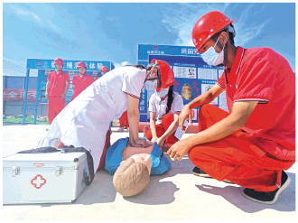 日前,兵团建工水电集团在六师水网供水项目举办安全生产现场观摩会。图为医疗救护组正在进行演练。 姜黎东摄