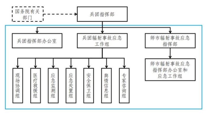 (11)兵团军事部:负责组织指挥民兵参加抢险救灾,协调驻军参加辐射事故救援工作。